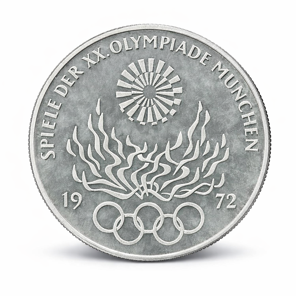 Na minci je vyobrazený typický nemecký orol spolu s olympijskými symbolmi, ktoré pripomínajú významné športové a historické udalosti.