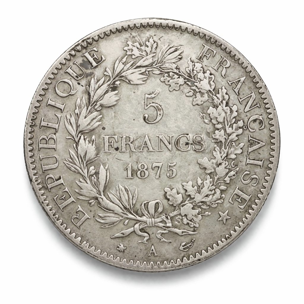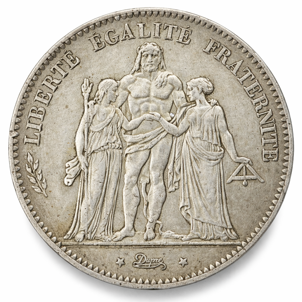 Na zadnej strane mince je zobrazený motív Herkula, ktorý symbolizuje silu a jednotu. Postava Herkula stojí v strede a spája dve ženské postavy – alegórie slobody a rovnosti. Tento ikonický motív vychádza z ideálov Francúzskej revolúcie, vyjadrených heslom "Liberté, Égalité, Fraternité".