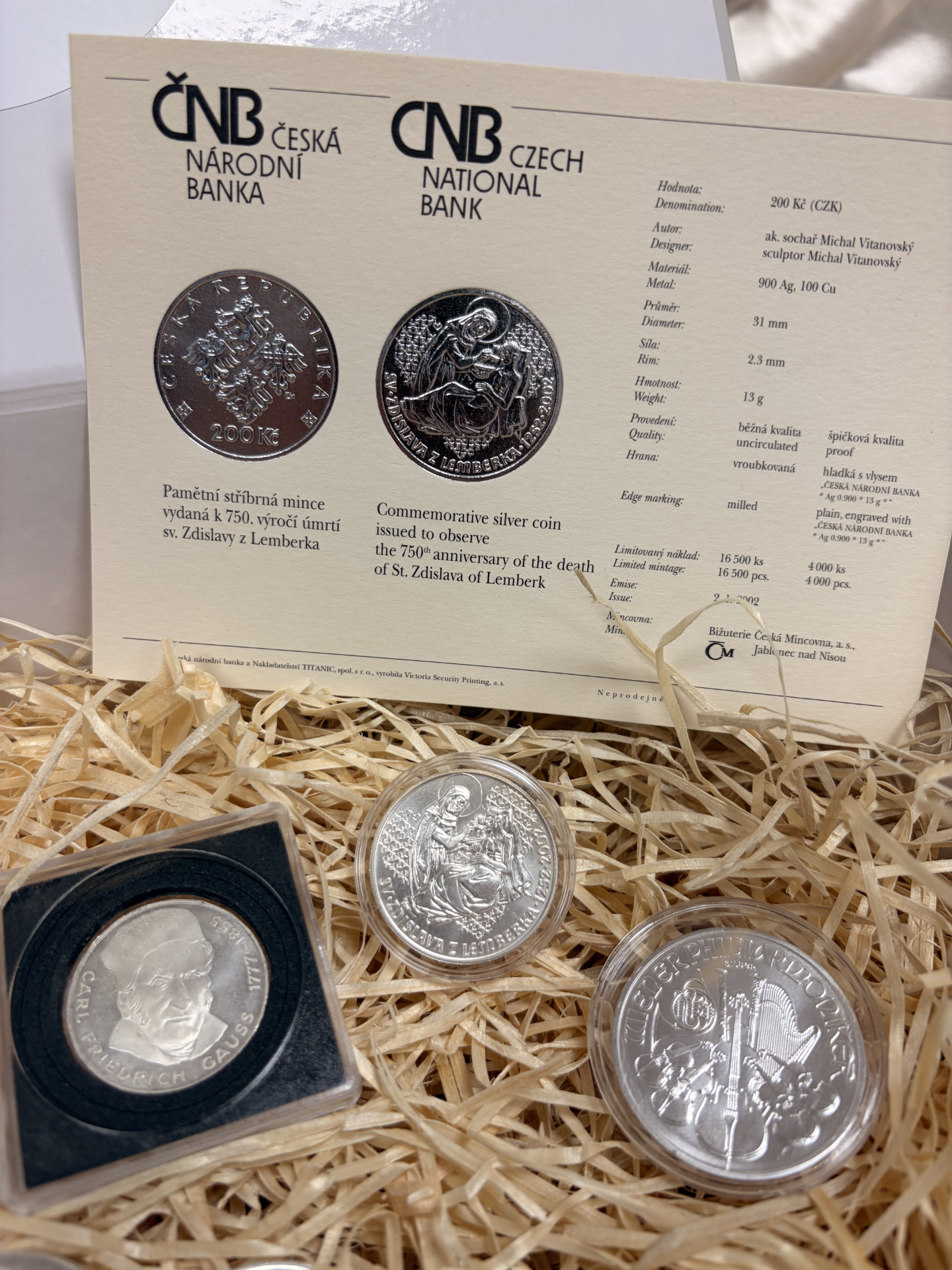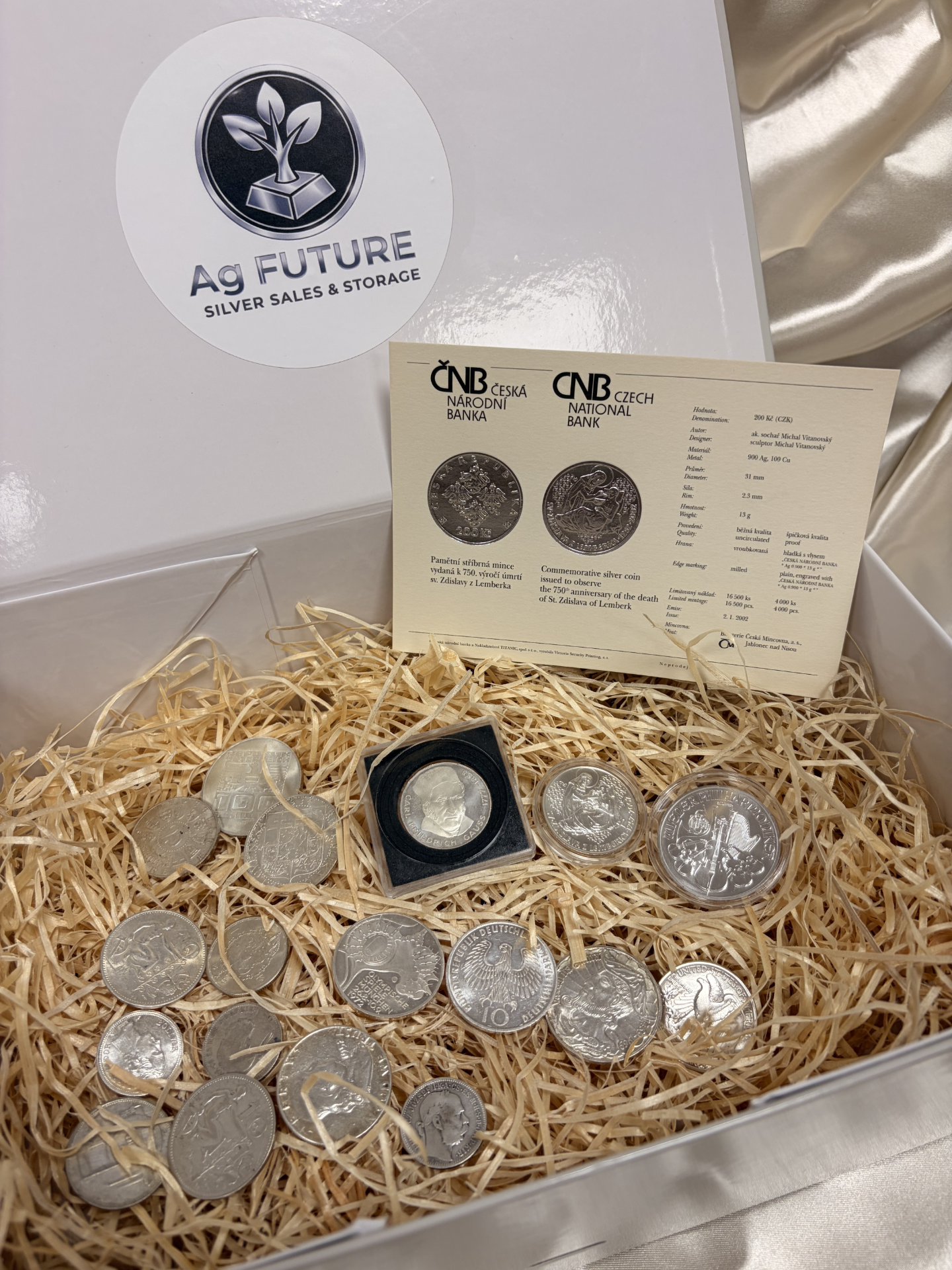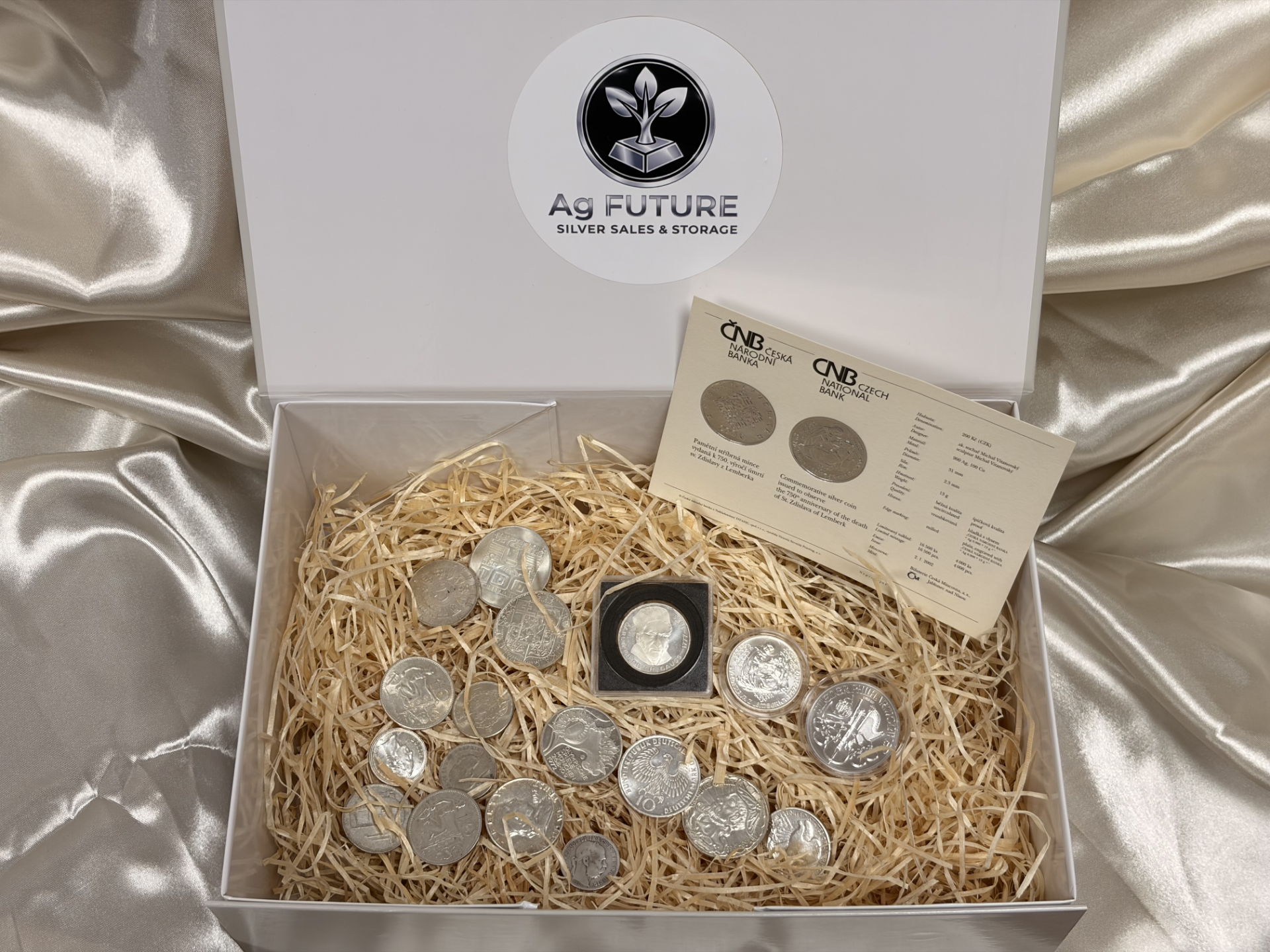 Upozornenie: Strieborné mince zobrazené na fotkách sú náhodné, podľa hmotnosti striebra v danom čase. Pri objednávke obdržíte iné zloženie, v súlade s dodacím listom a Všeobecnými obchodnými podmienkami.