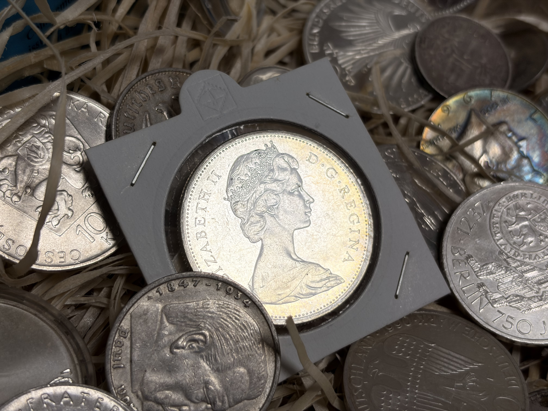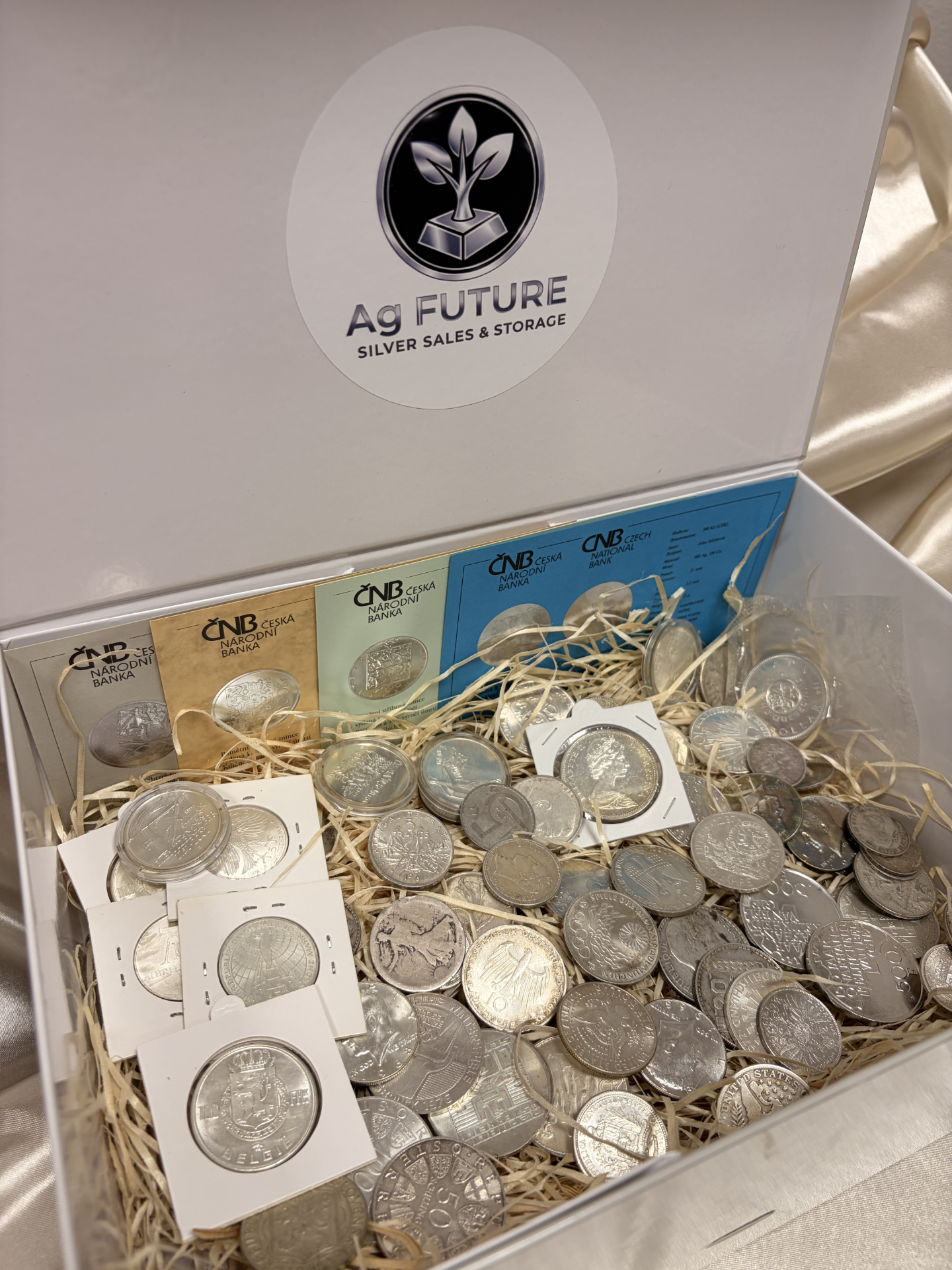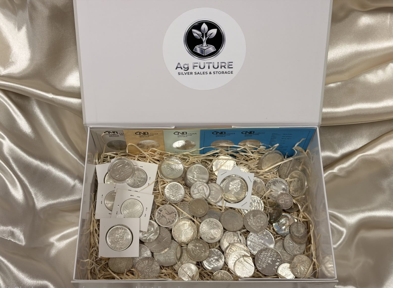 Upozornenie: Strieborné mince zobrazené na fotkách sú náhodné, podľa hmotnosti striebra v danom čase. Pri objednávke obdržíte iné zloženie, v súlade s dodacím listom a Všeobecnými obchodnými podmienkami.